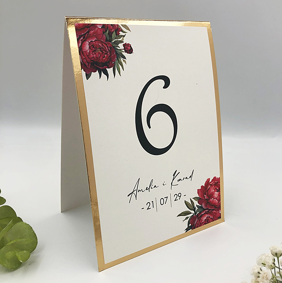 Numery na stoły weselne ze złotą lustrzaną ramką i bordowymi kwiatami