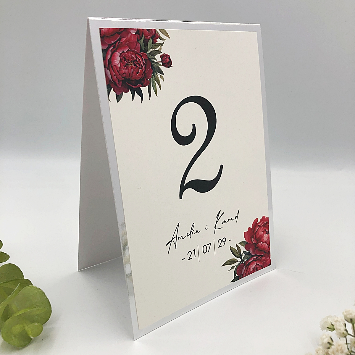 Numery na stoły weselne ze srebrną lustrzaną ramką i bordowymi kwiatami