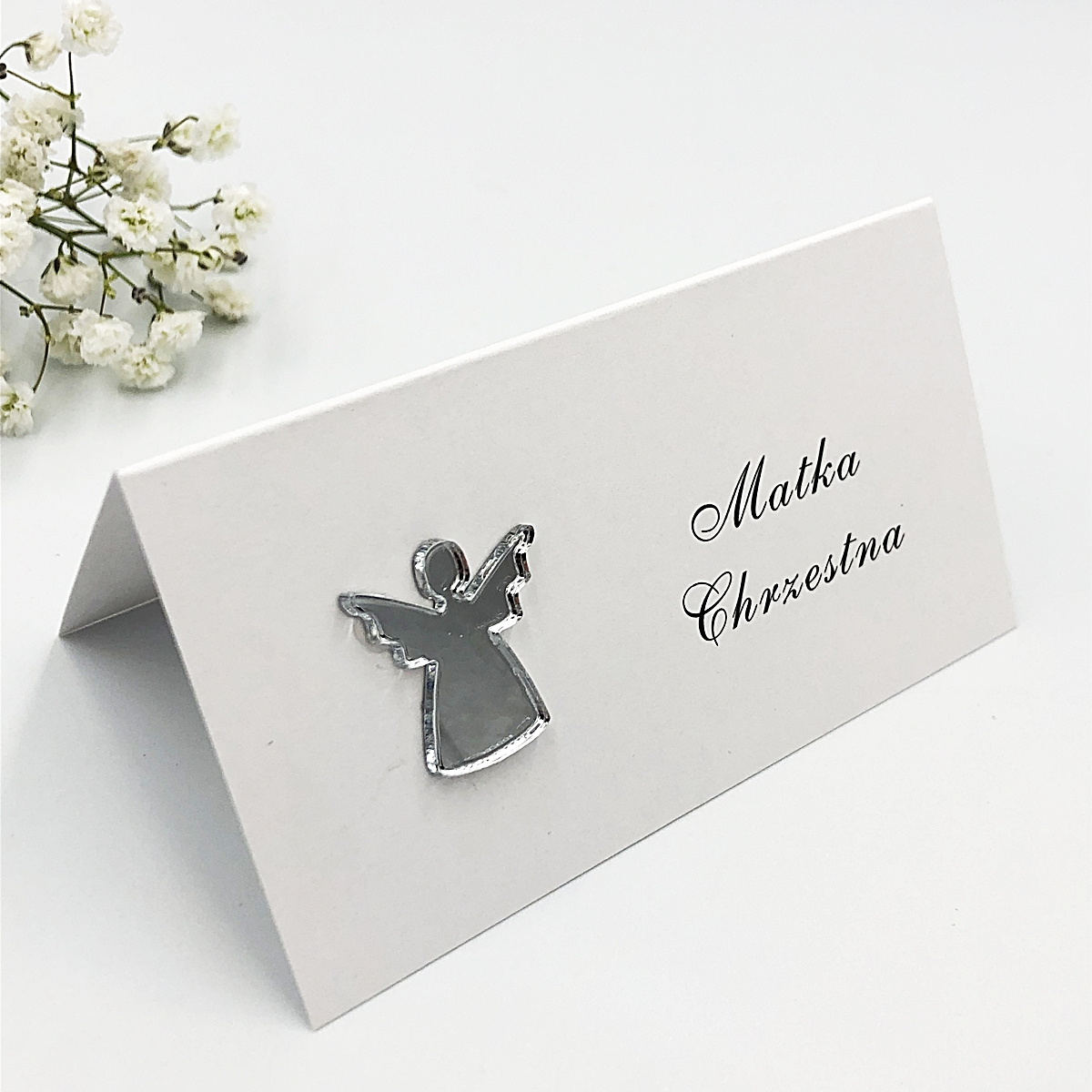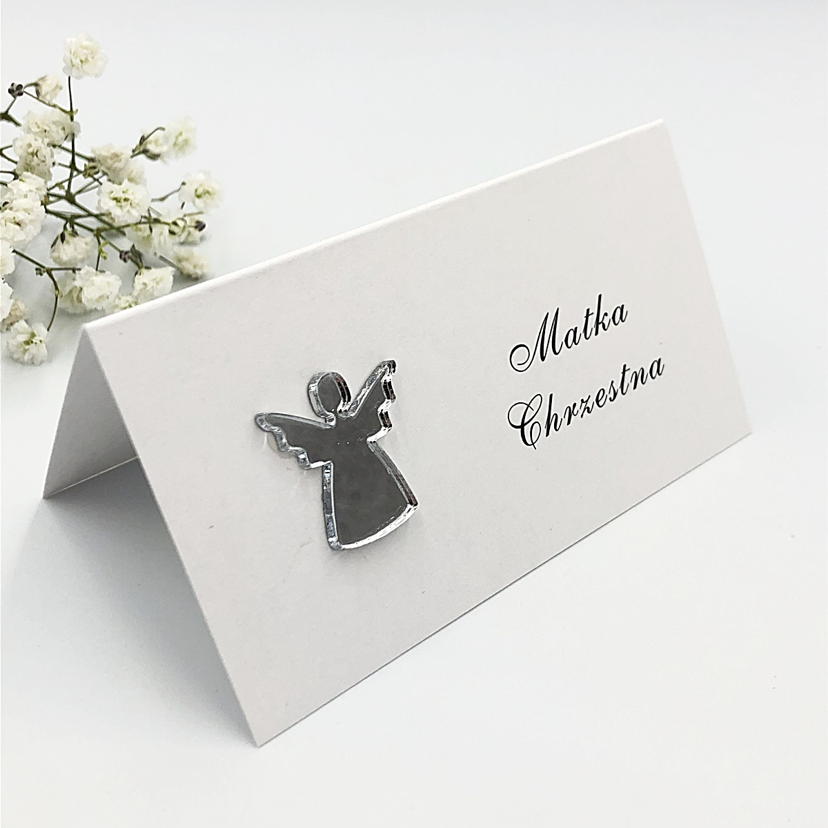 Białe winietki Komunijne ozdobione srebrnym aniołkiem z lustrzanej pleksi