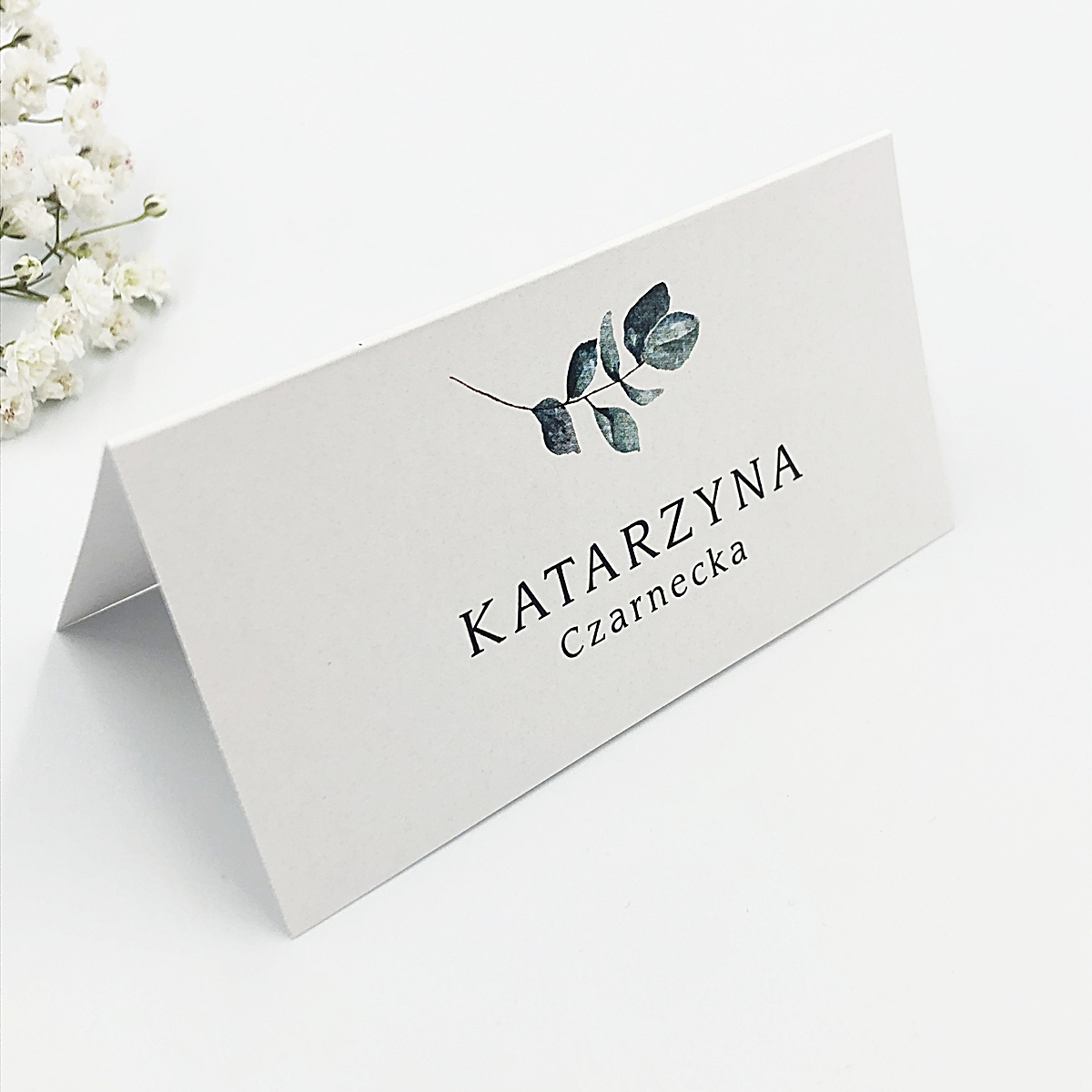 Winietki ślubne personalizowane z gałązką eukaliptusa w zielonym kolorze