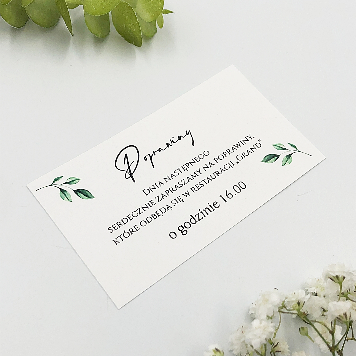 Wkładki do zaproszeń ślubnych z informacją o poprawinach, ozdobione zielonymi listkami