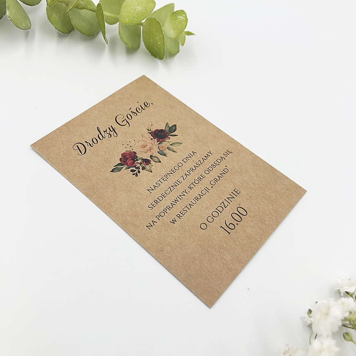 Ekologiczny design – Projekt pasujący do rustykalnych i ekologicznych stylów zaproszeń ozdobiony oryginalną grafiką bordowych kwiatów