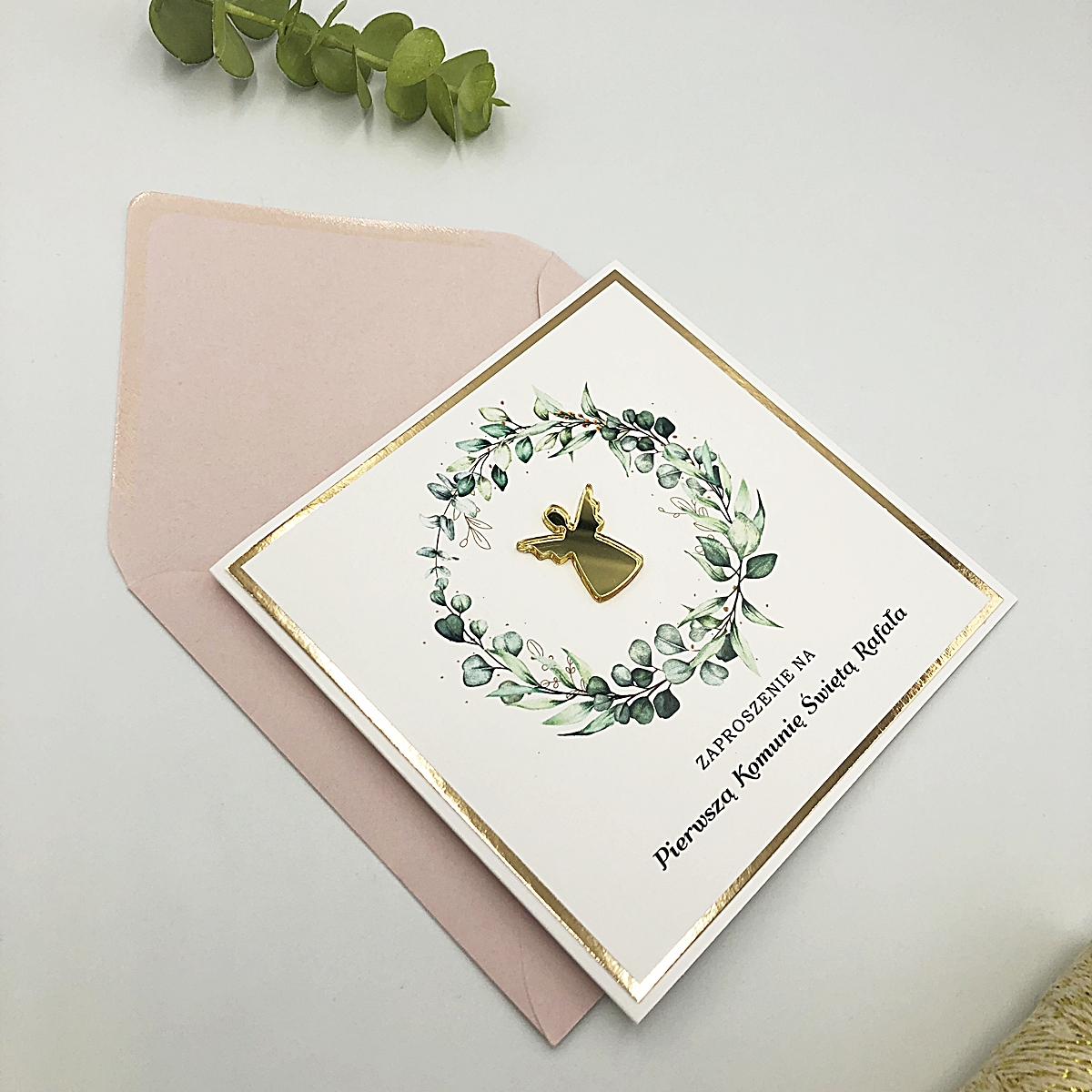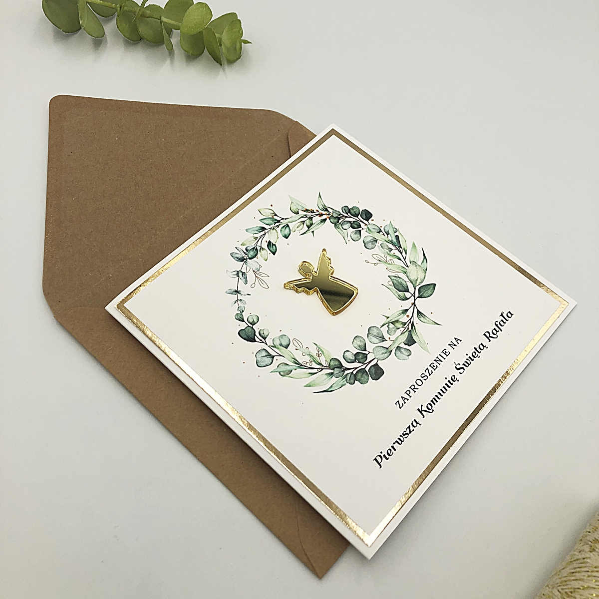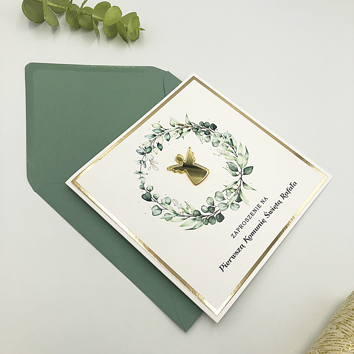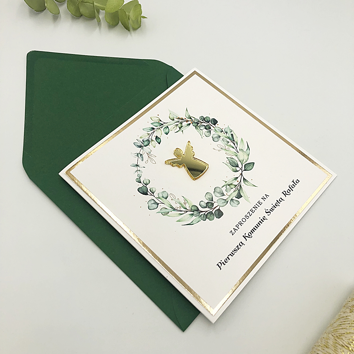 Zaproszenia na komunię komunijne do uzupełnienia złote lustrzane zielony wianek