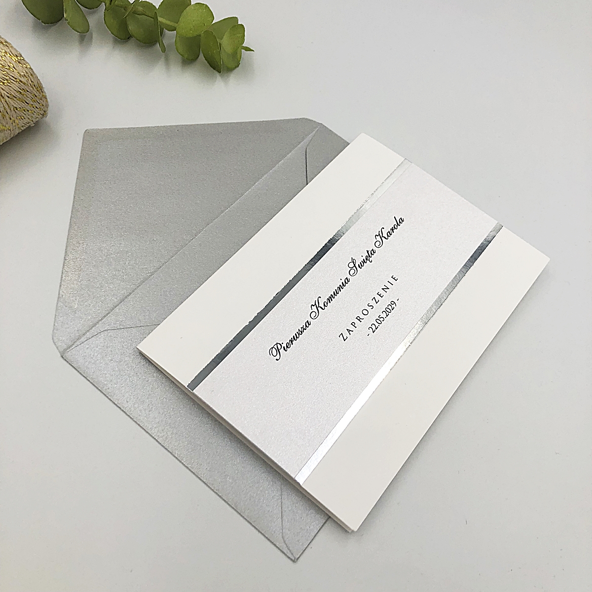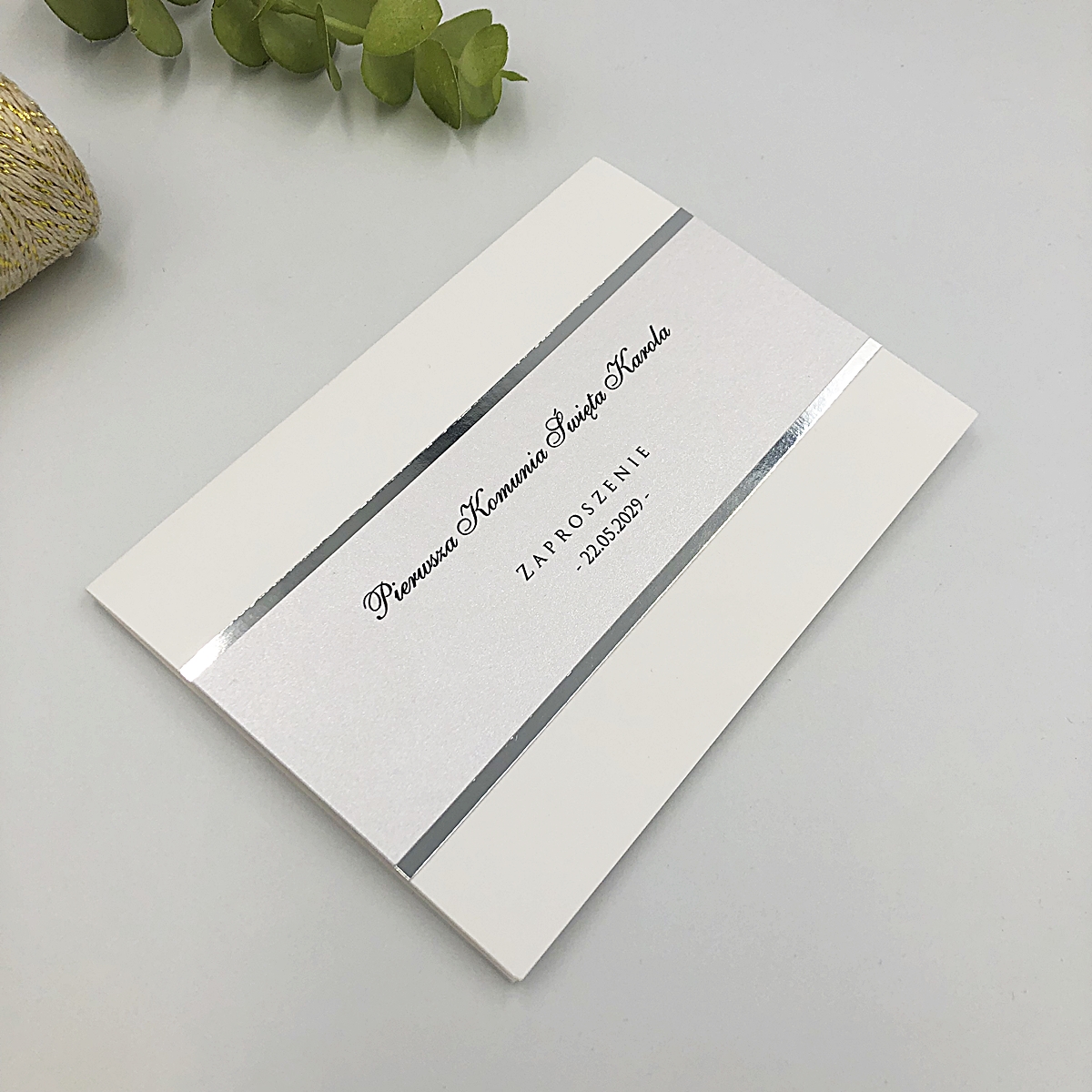 Zaproszenia na komunię świętą, chrzest święty glamour mirror, srebrny pasek 01