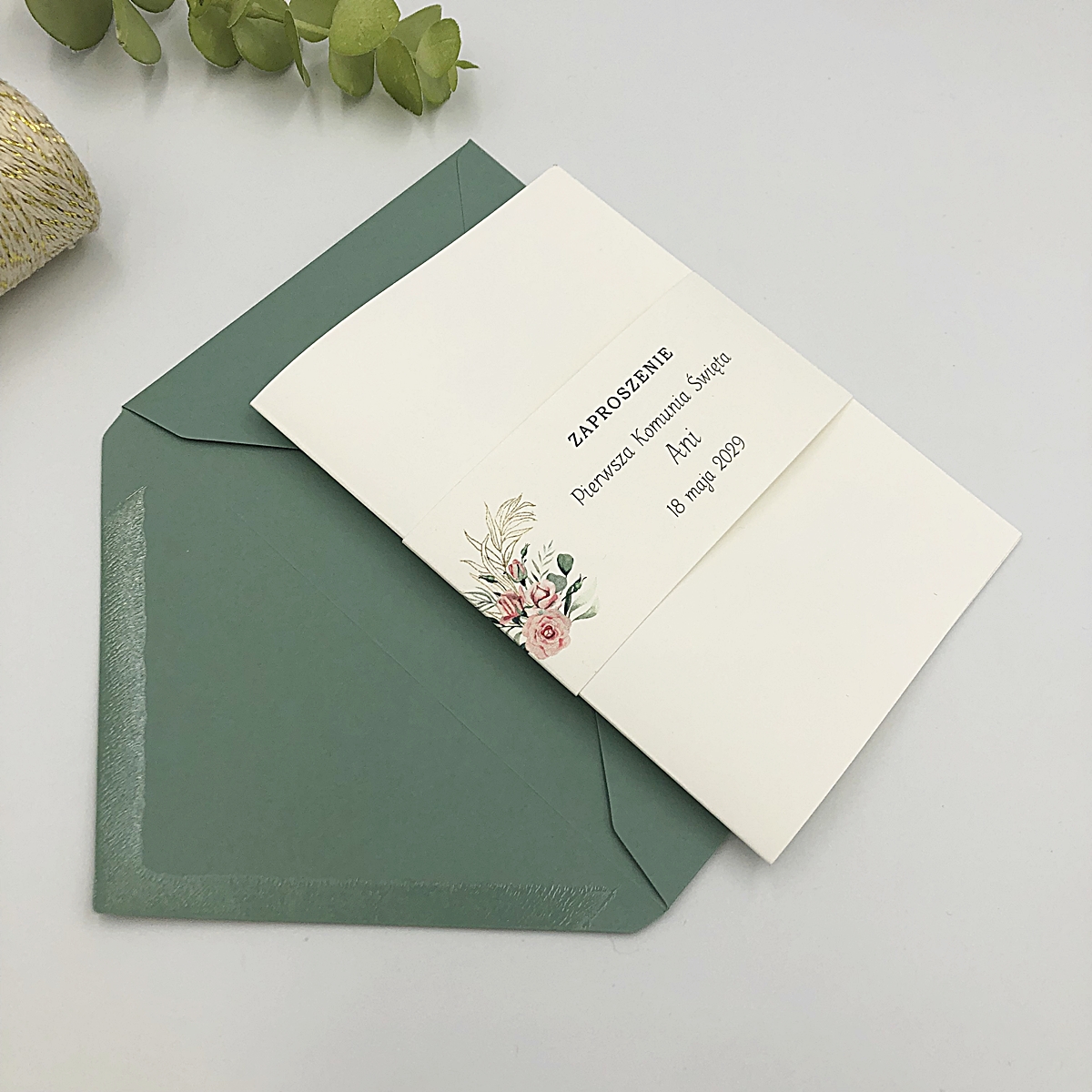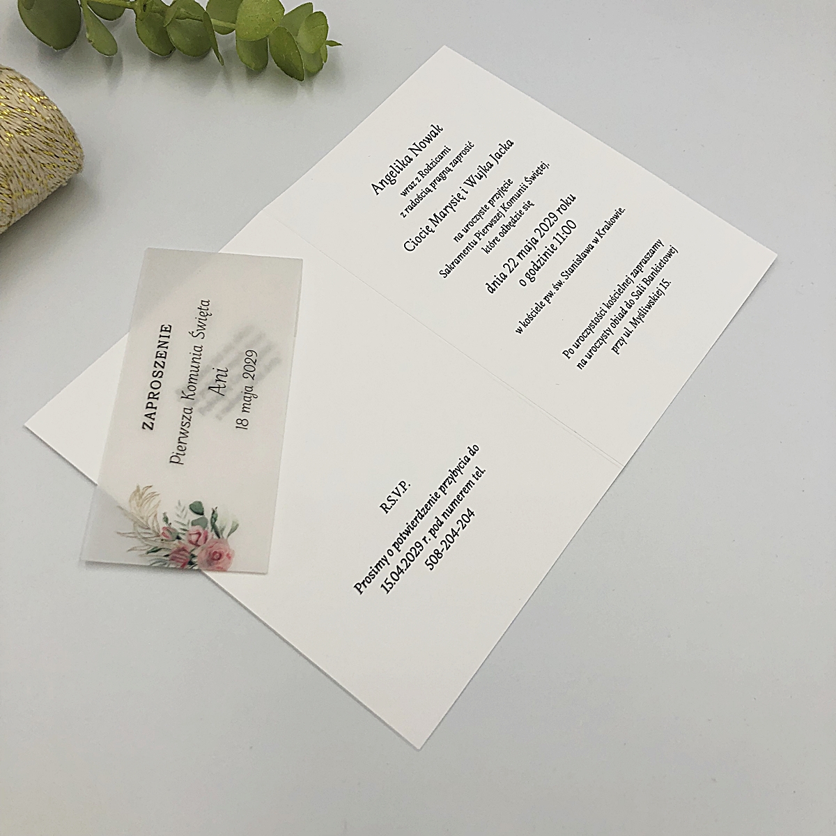 Strona główna Komunia Zaproszenia personalizowane na komunię Zaproszenia na komunię świętą, chrzest święty z opaską, flowers, różowe kwiaty
