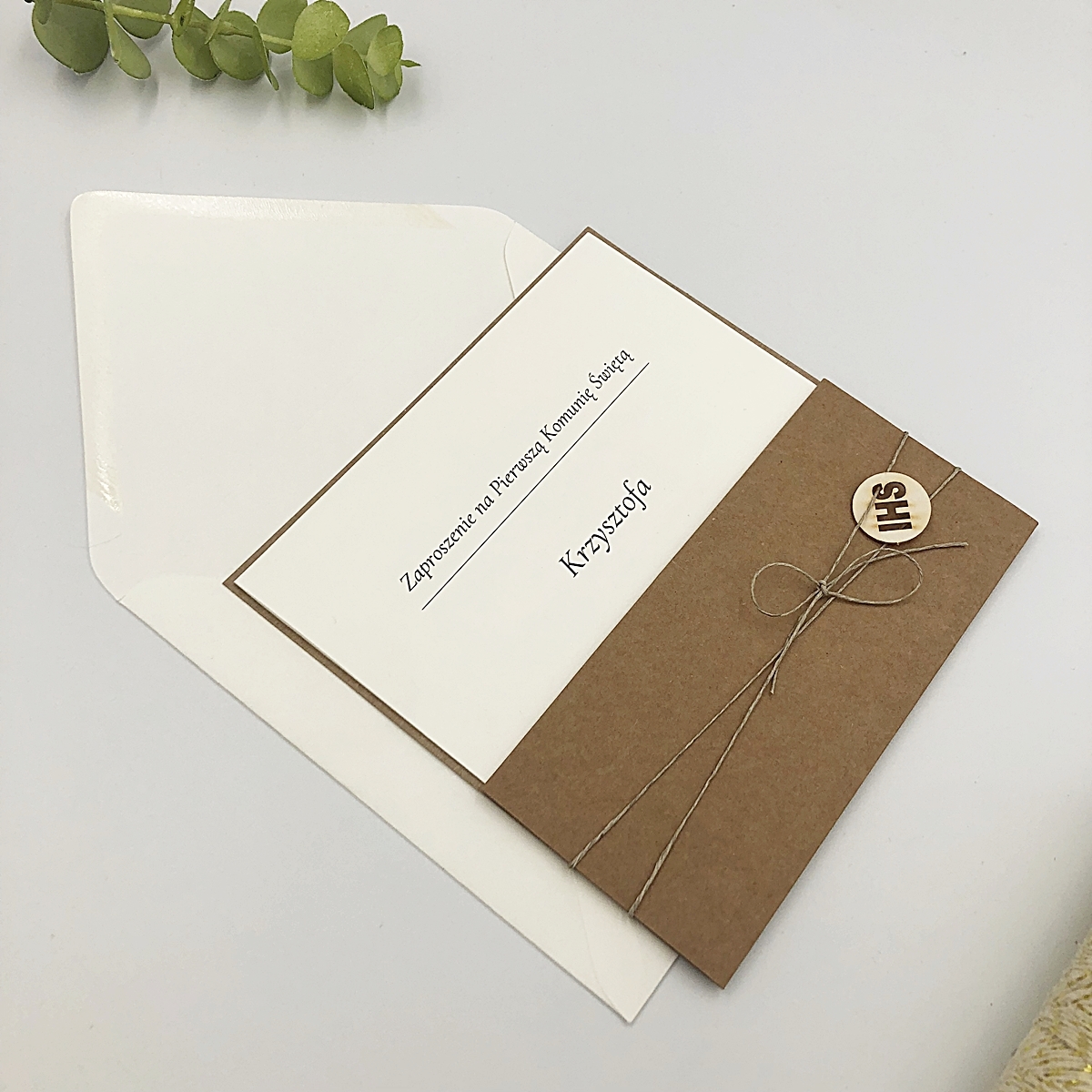 lnianym sznurkiem z drewnianą aplikacją IHS oraz składanego zaproszenia, otwieranego do góry.