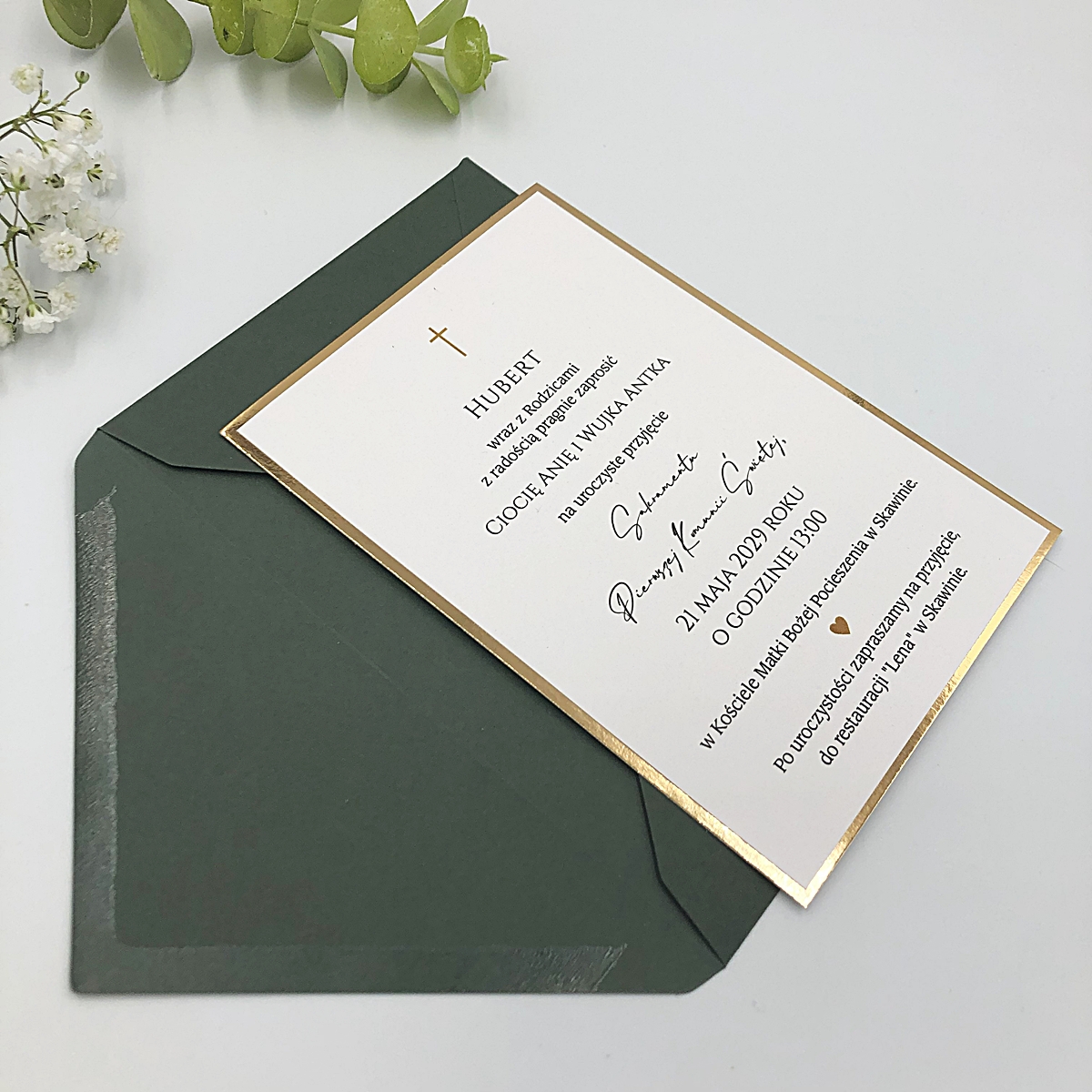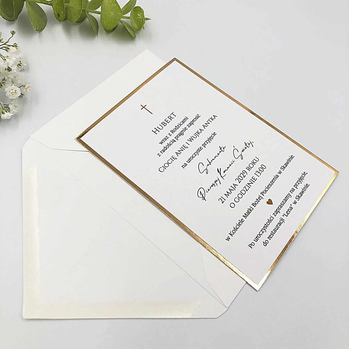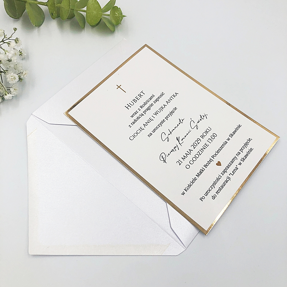 Zaproszenia zostały zaprojektowane w formie karty w stylu glamour, ozdobione grafiką minimalistycznego krzyżyka oraz złotą lustrzaną ramką