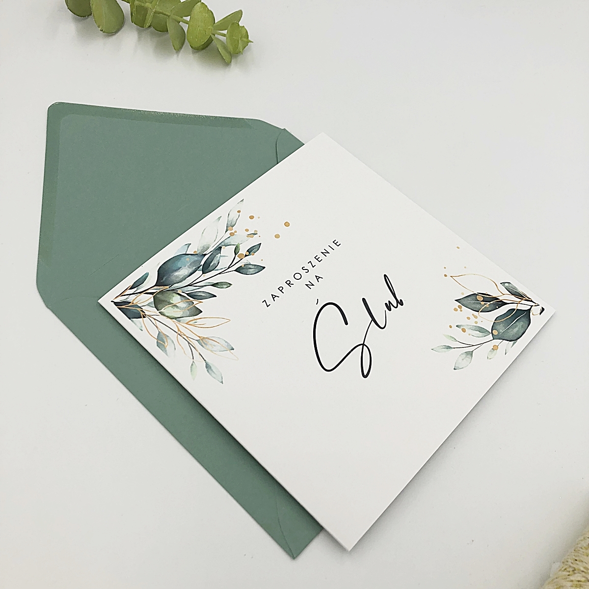 Zaproszenie wykonane z najwyższej jakości kartonu wizytówkowego 300g. w kolorze białym. Zaprojektowane w stylu botanicznym, ozdobione grafiką złoto zielonych listków. Dzięki neutralnej treści zaproszenia nadają się zarówno na ślub cywilny jak i kościelny.