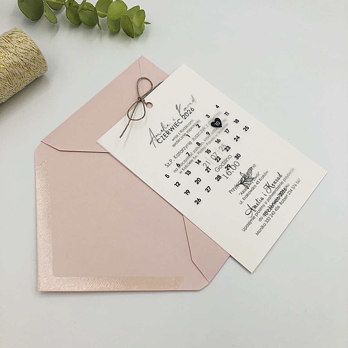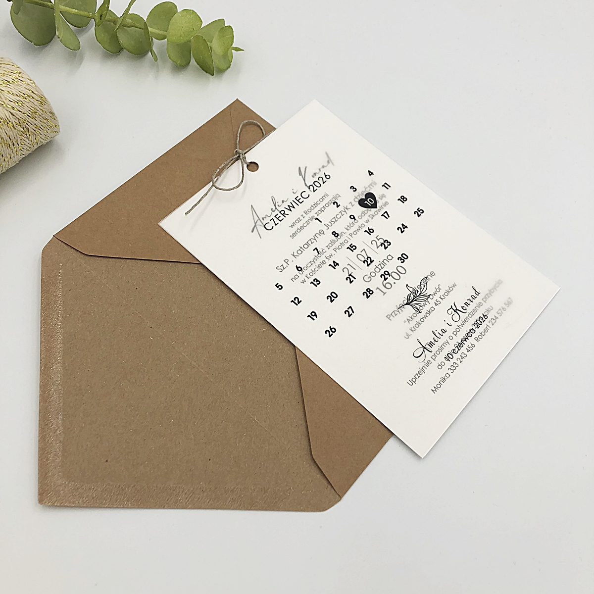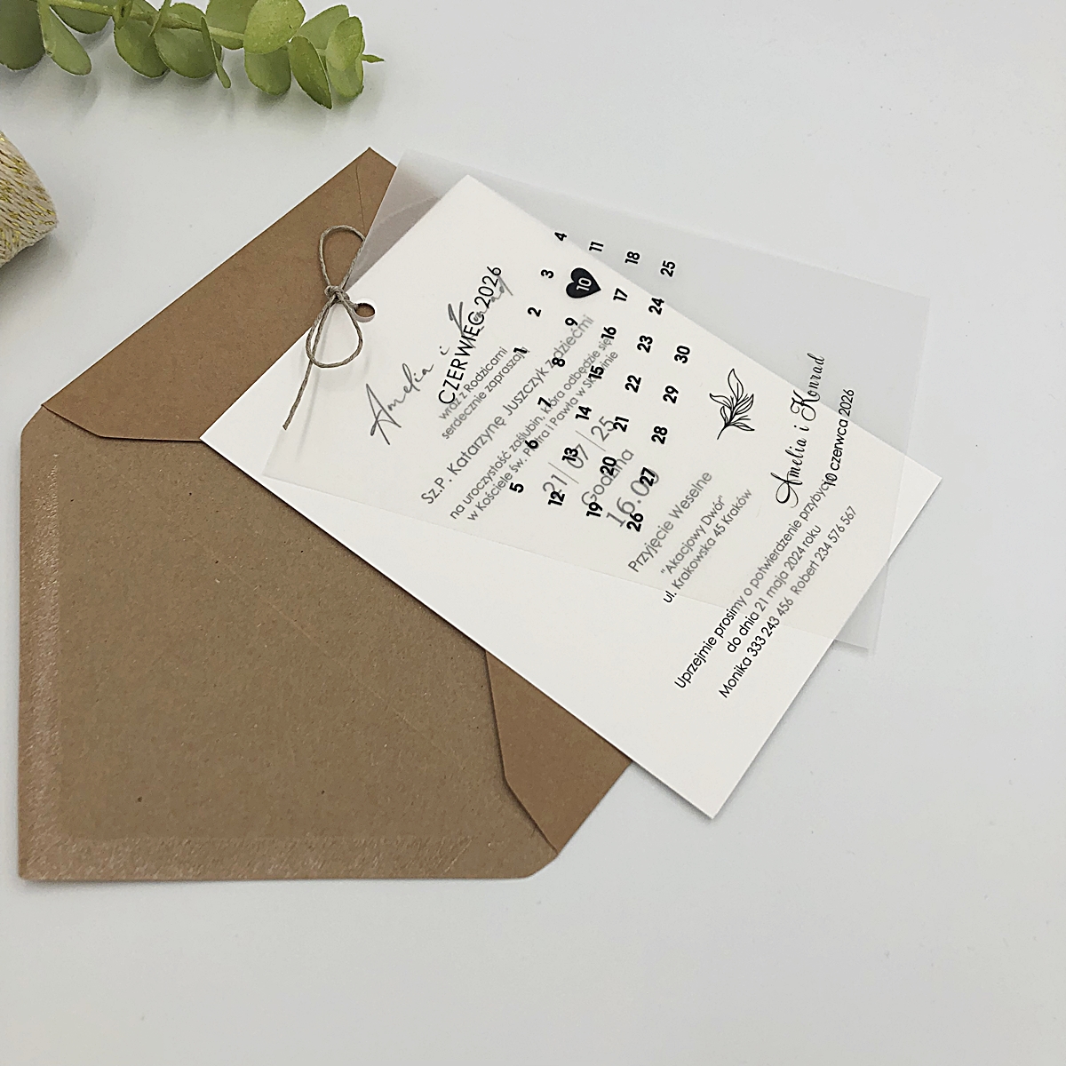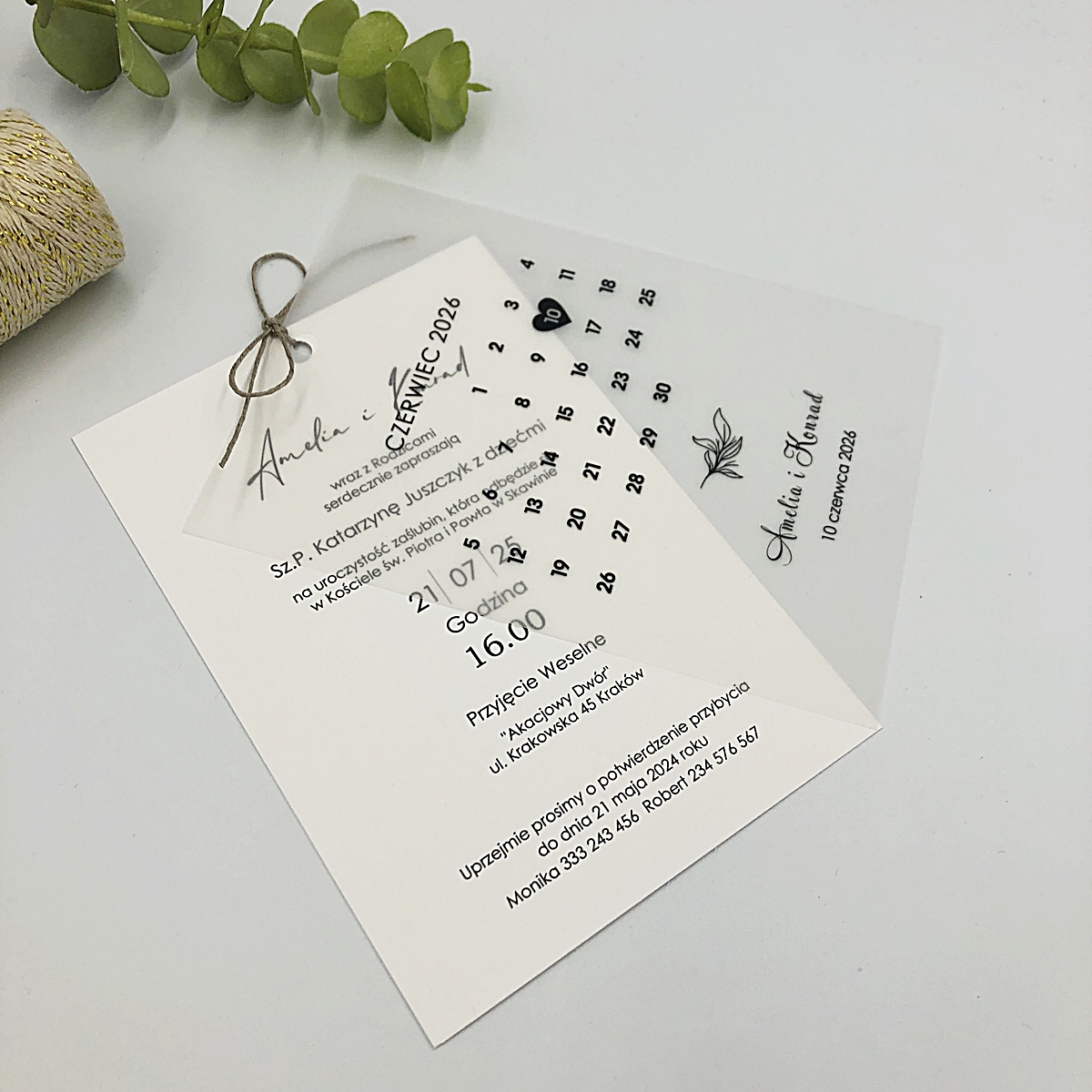 Pierwsza strona wykonana z półprzezroczystej kalki stylizowana jest na kartkę z kalendarza. Data ślubu zaznaczona jest w serduszku. Kartę ozdabia minimalistyczna grafika gałązki z listkami.